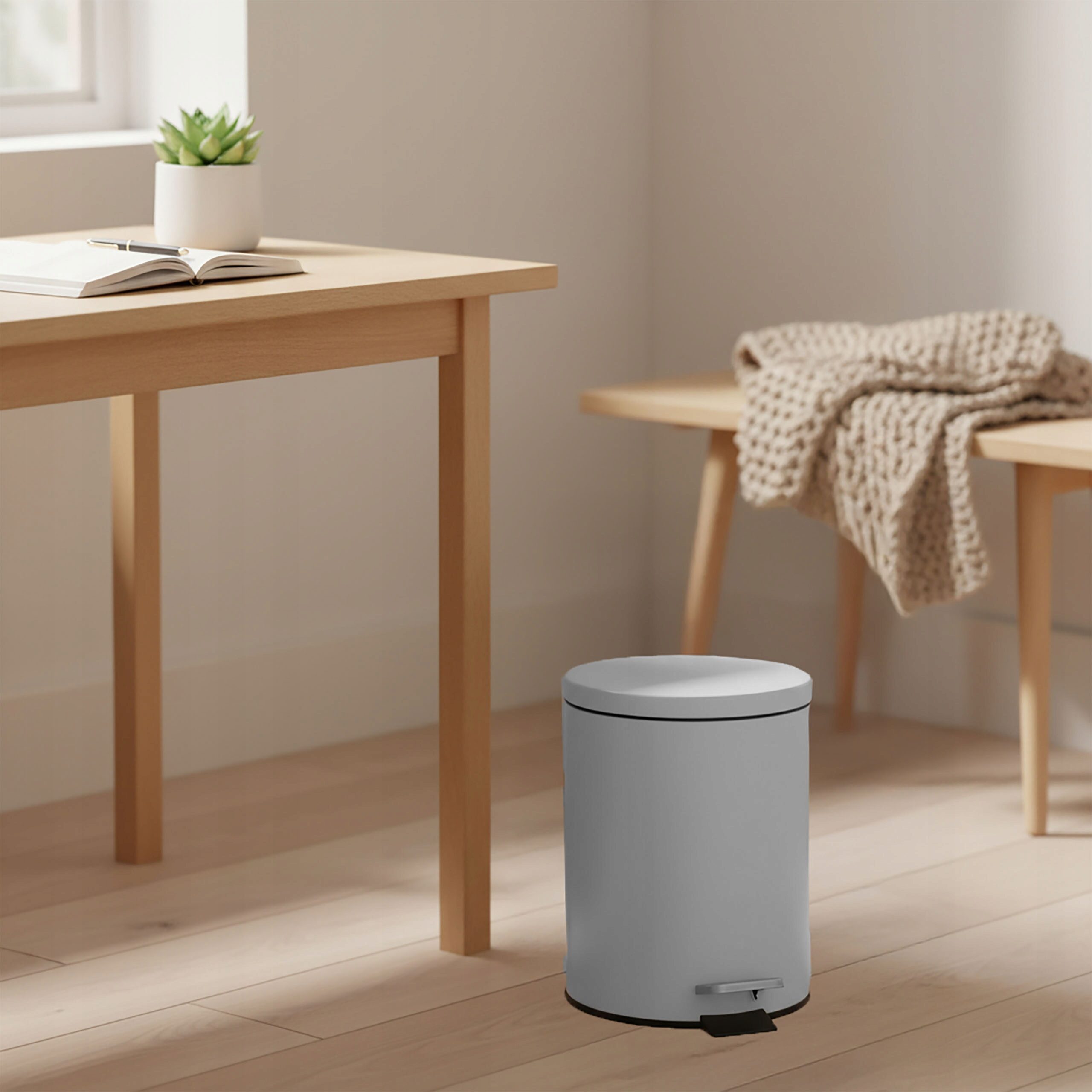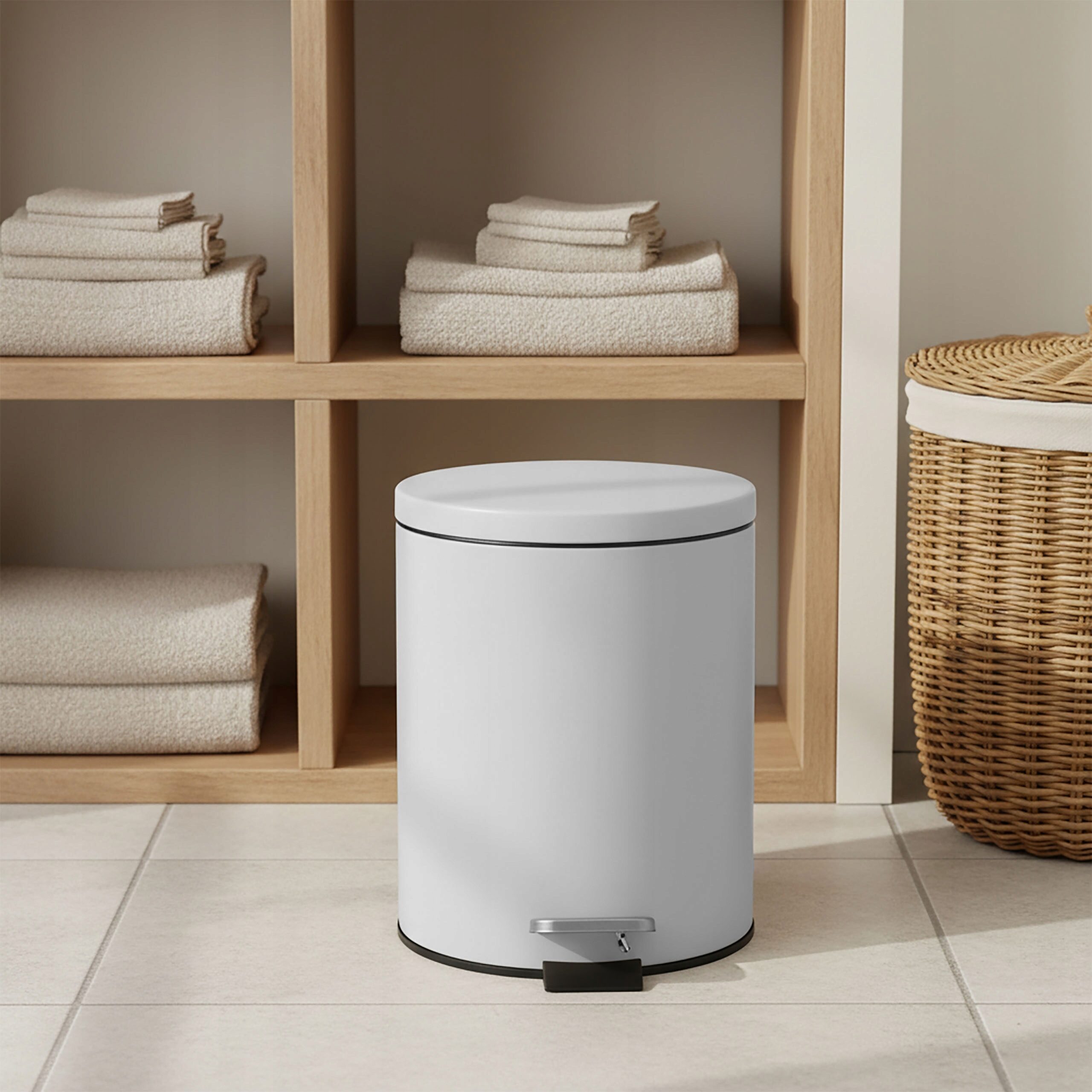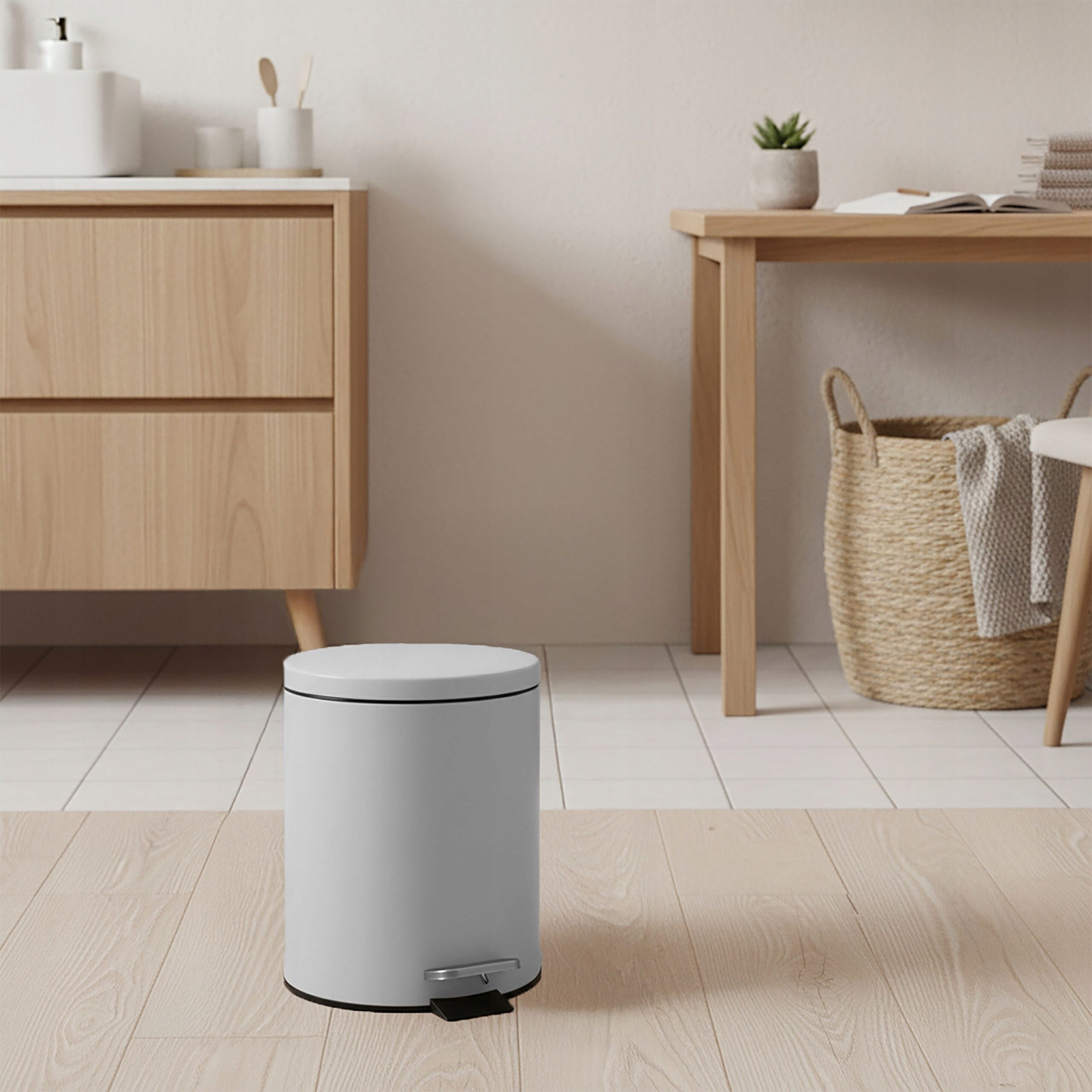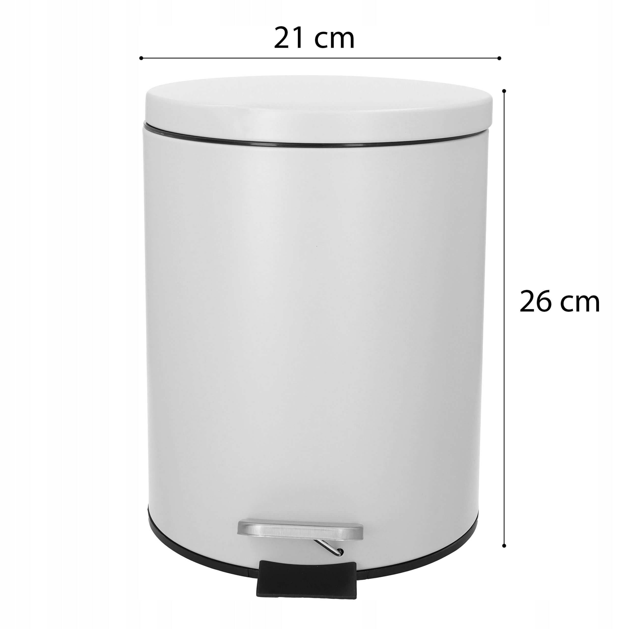 Praktyczny i stylowy kosz na śmieci o pojemności 5 litrów to idealne rozwiązanie do łazienki, kuchni, biura czy gabinetu. Wykonany z metalu malowanego proszkowo, jest trwały, odporny na uszkodzenia i prezentuje się elegancko dzięki matowemu wykończeniu. Wyposażony w pedał nożny pozwala na wygodne i higieniczne otwieranie, a wyjmowany wkład ułatwia opróżnianie i utrzymanie czystości.