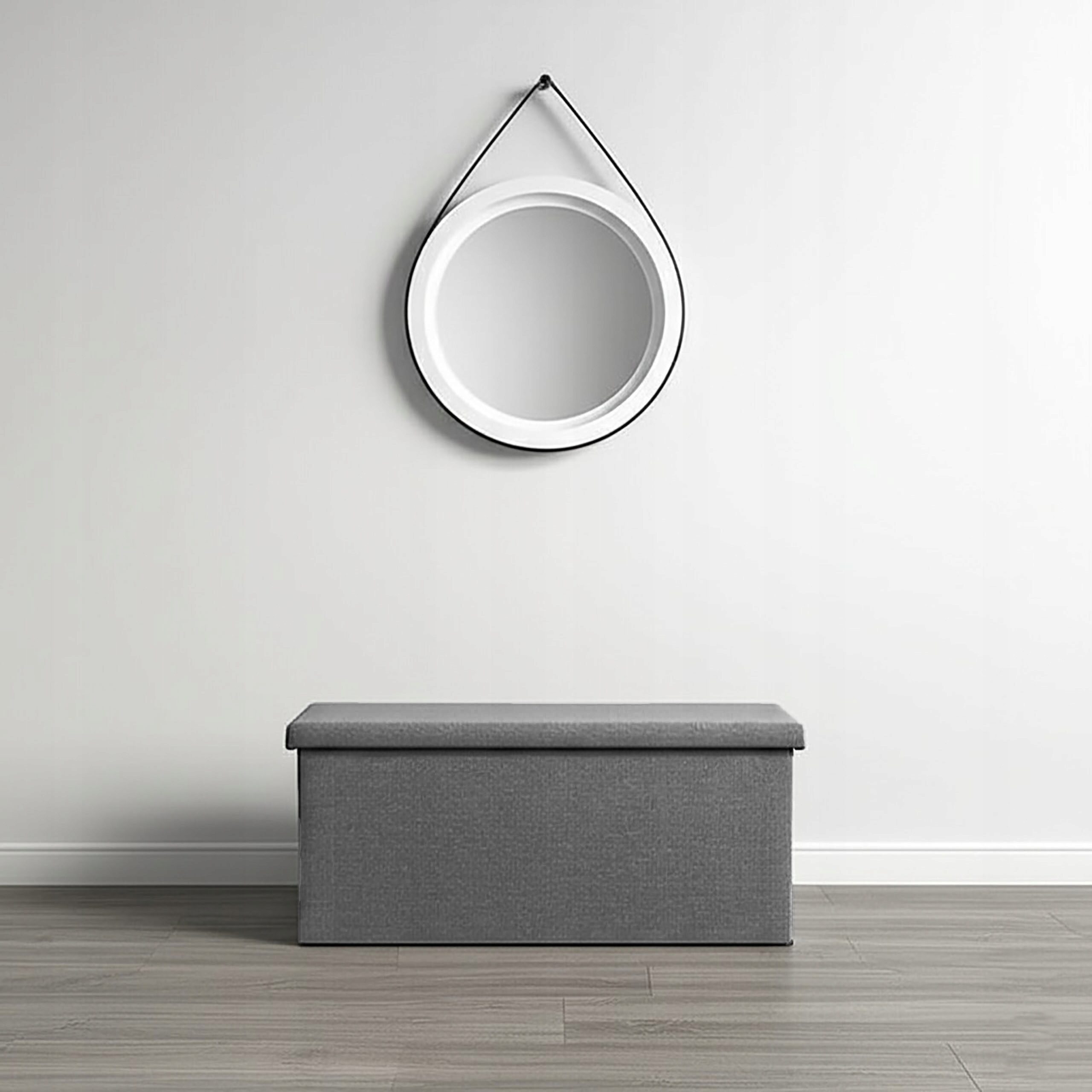 Duża, składana pufa z funkcją schowka to praktyczne połączenie siedziska, pojemnika i elementu dekoracyjnego. Tapicerowana ciemnoszarym poliestrem z ciemnoszarą lamówką, pasuje do nowoczesnych i klasycznych wnętrz.